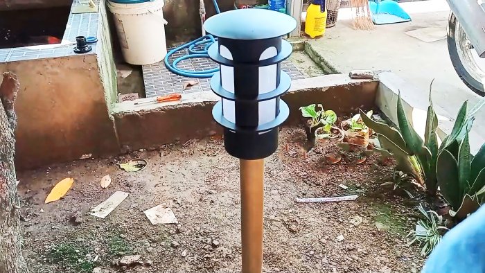 Для сборки светильника потребуется выполнить несколько простых шагов: сначала подготовить пластиковую трубу, которая будет служить стойкой, затем провести внутри нее электрический кабель. После этого трубу устанавливают вертикально, погружая ее в заранее подготовленное отверстие в земле.